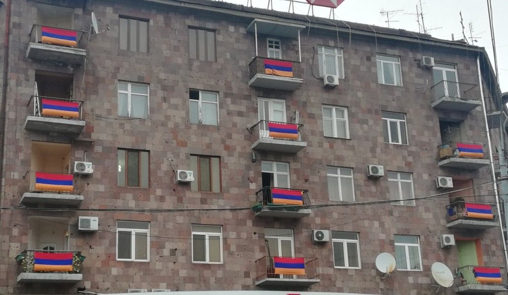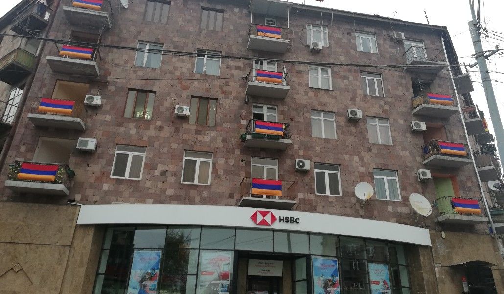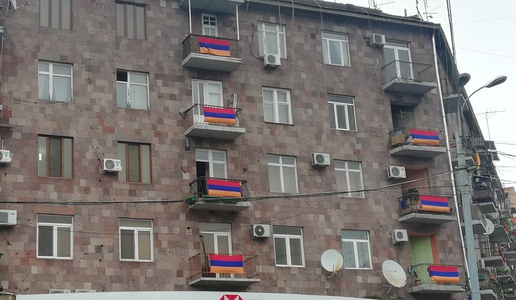 Եռագույն դրոշներ՝ երեւանյան շենքերից մեկի պաշտգամբներին