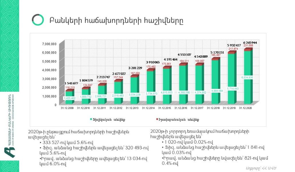 2020թ-ին բանկերի հաճախորդների թիվն աճել է 7.5%-ով` կազմելով 3 251 281: Մասնավորապես՝ ֆիզիկական անձանց թիվն ավելացել է 219 397-ով կամ 7.5%-ով (3 146 319 հաճախորդ), իրավաբանական անձանց թիվը՝ 6 451-ով կամ 6.5%-ով (104 962 հաճախորդ):