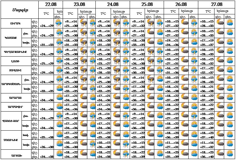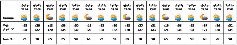 Հայաստանի տարածքում օգոստոսի 22-ի ցերեկը, 23-26-ին` գիշերը և կեսօրից հետո առանձին շրջաններում սպասվում է կարճատև անձրև և ամպրոպ, առանձին հատվածներում հնարավոր է նաև կարկուտ։ Օգոստոսի 27-ին սպասվում է առանց տեղումների եղանակ:
