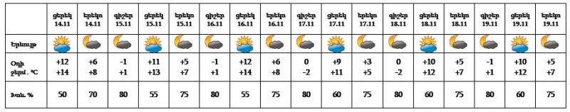 Երևան քաղաքում նոյեմբերի 14-ի ցերեկը, 15-19-ն սպասվում է առանց տեղումների եղանակ։