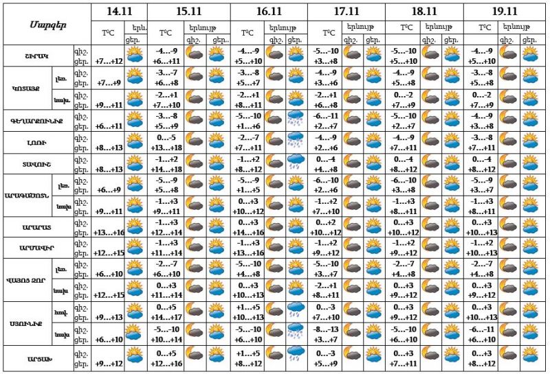 Աջակցիր «Ա1+»-ինՀայաստանի տարածքում նոյեմբերի 14-ի ցերեկը, 15-ին, 16-ի գիշերը, 17-19-ն սպասվում է առանց տեղումների եղանակ: Նոյեմբերի 16-ի ցերեկը առանձին շրջաններում սպասվում են թույլ տեղումներ: