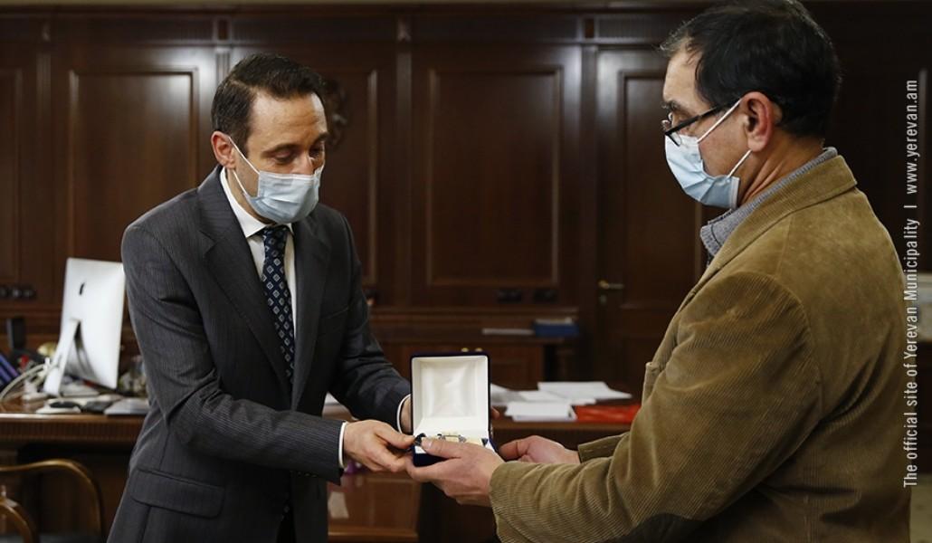 Աջակցիր «Ա1+»-ինԵրևանի քաղաքապետ Հայկ Մարությանը քաղաքապետարանում հյուրընկալել է ՀՀ ժողովրդական արտիստ, պարուսույց Արտյուշա Կարապետյանին, ՀՀ ժողովրդական արտիստ, պարուսույց Նորայր Մեհրաբյանին և ՀՀ ժողովրդական նկարիչ, գեղանկարիչ Ռոբերտ Էլիբեկյանի որդուն՝ Արեգ Էլիբեկյանին ու նրանց հանձնել Երևանի պատվավոր քաղաքացու հավաստագրերն ու հուշամեդալները: