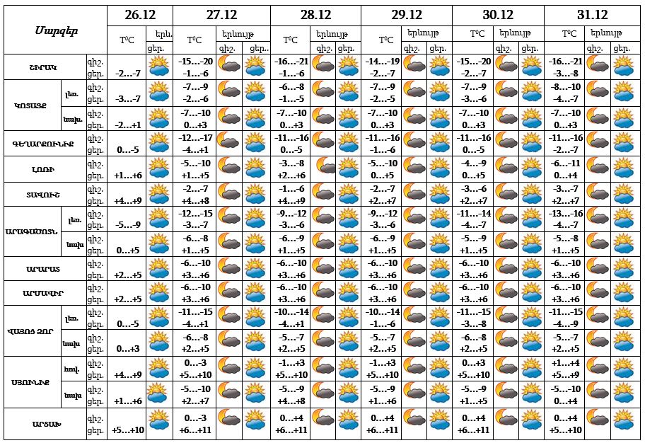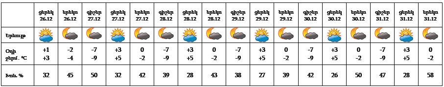 Երևան քաղաքում դեկտեմբերի 26-ի ցերեկը, 27-31-ը սպասվում է առանց տեղումների եղանակ: