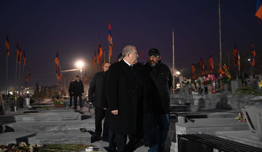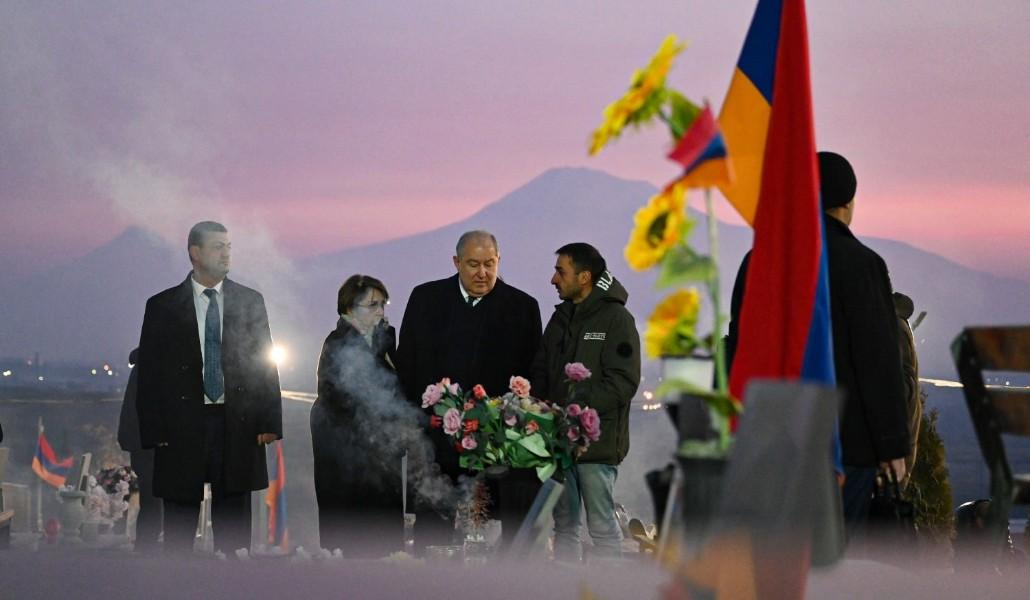Հանրապետության նախագահը և տիկին Սարգսյանը հարգանքի տուրք են մատուցել արցախյան պատերազմում իրենց կյանքը Հայրենիքի պաշտպանության համար զոհաբերած հերոսների հիշատակին, ծաղիկներ դրել նրանց շիրիմներին, մեկ րոպե լռությամբ հարգել նահատակված հերոսների անմահ հիշատակը: