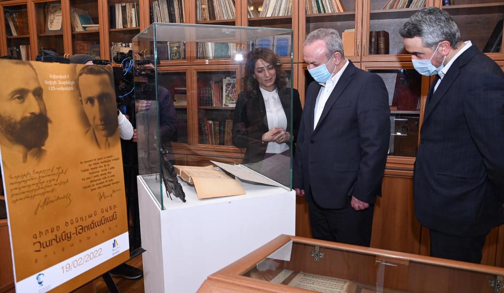 Այնուհետև նախարարը մասնակցել է թանգարանում բացված «Գիրքը՝ ծննդյան նվեր. Չարենց-Թումանյան» խորագրով ցուցադրության բացմանը: Ցուցադրությունն իրականացվում էր Հովհաննես Թումանյանի թանգարանի և Եղիշե Չարենցի տուն-թանգարանի համագործակցությամբ: Հովհ. Թումանյանի թանգարանի տնօրեն Անի Եղիազարյանի տեղեկացմամբ՝ Թումանյանի անձնական գրադարանից Չարենցի ընծայագրերով և Չարենցի անձնական գրադարանից Թումանյանի ընտանիքի անդամների ընծայագրերով գրքերը բացառիկ են և երբևէ չեն ցուցադրվել: