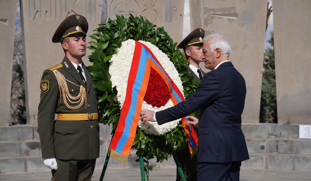 Նախագահ Խաչատուրյանը ծաղիկներ է դրել ՀՀ Ազգային հերոս Վազգեն Սարգսյանի, զորավար Անդրանիկի շիրիմներին, պատվո պահակախմբի ուղեկցությամբ ծաղկեպսակ է դրել Հայրենիքի ազատության և անկախության համար զոհվածների սխրանքը հավերժացնող հուշապատին: