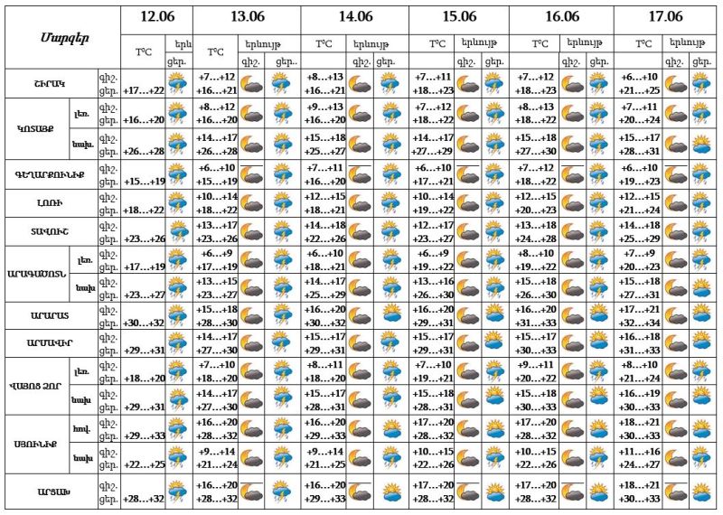 Ըստ աղբյուրի՝ Երևան քաղաքում հունիսի 12-ի երեկոյան ժամերին, 13-17-ի գիշերը և երեկոյան ժամերին սպասվում է կարճատև անձրև և ամպրոպ, ամպրոպի ժամանակ սպասվում է նաև քամու ուժգնացում մինչև 18-20 մ/վ արագություն: