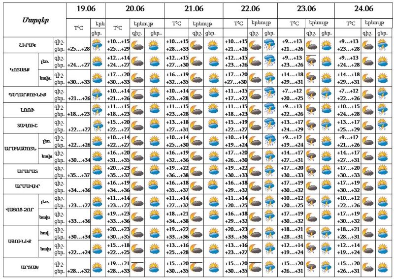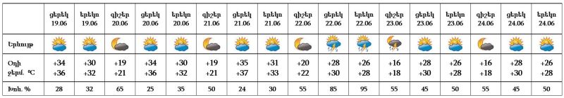 Երևան քաղաքում հունիսի 19-ի ցերեկը, 20-21-ը, 23-ի ցերեկը, 24-ին սպասվում է առանց տեղումների եղանակ: Հունիսի 22-ի կեսօրից հետո, 23-ի գիշերը սպասվում է անձրև և ամպրոպ, ամպրոպի ժամանակ նաև քամու ուժգնացում՝ մինչև 17-20 մ/վ արագություն: