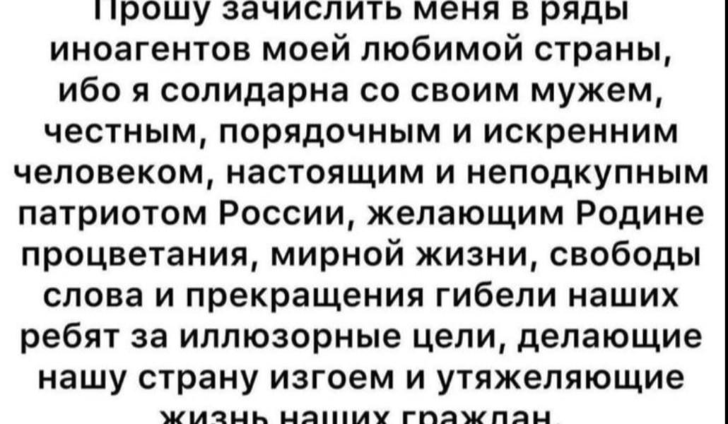 Ուրբաթ օրը Արդարադատության նախարարությունը նրա ամուսնուն՝ Մաքսիմ Գալկինին ճանաչել է օտարերկրյա գործակալ։ Վերջինս բազմիցս արտահայտվել է Ուկրաինայում ռազմական գործողության դեմ։