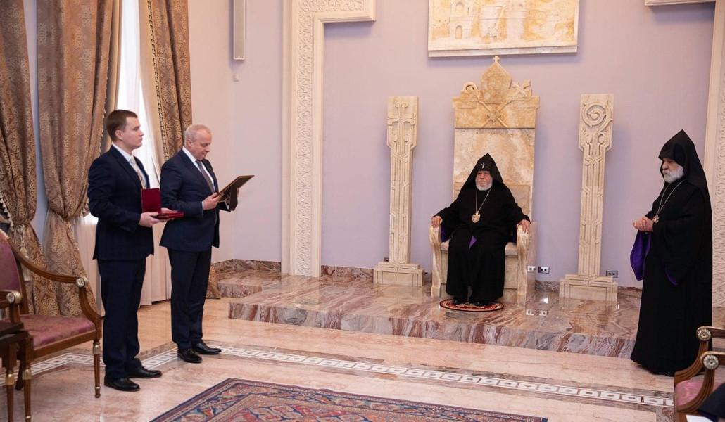 Այնուհետև Ամենայն Հայոց Հայրապետն իր օրհնությունն ու պատգամը փոխանցեց ներկաներին։ Հայոց Հովվապետը, ի դեմս ՌԴ դեսպանի, շնորհակալություն հայտնելով նախագահ Վլադիմիր Պուտինին ազնիվ ուշադրության և գնահատանքի համար, ի մասնավորի ընդգծեց.