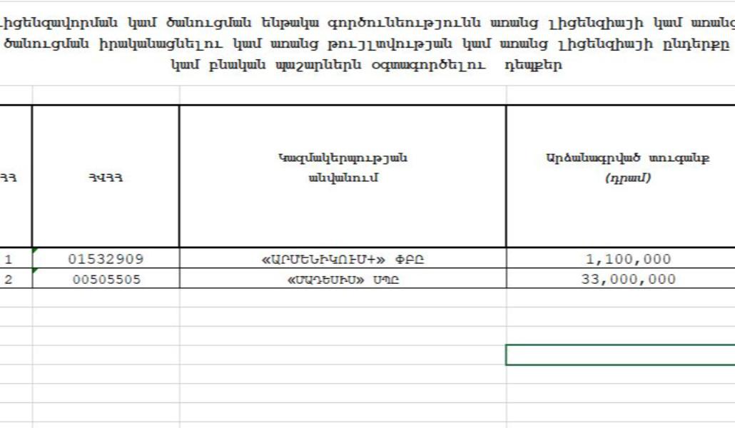 2 դեպքով արձանագրվել են լիցենզավորման կամ ծանուցման ենթակա գործունեությունն առանց լիցենզիայի կամ առանց ծանուցման իրականացնելու կամ առանց թույլտվության կամ առանց լիցենզիայի ընդերքը կամ բնական պաշարներն օգտագործելու խախտումներ։ Արձանագրված խախտումների գումարը կազմում է 34,100,000 ՀՀ դրամ։ Ներկայացվում է լիցենզավորման կամ ծանուցման ենթակա գործունեությունն առանց լիցենզիայի կամ առանց ծանուցման իրականացնելու կամ առանց թույլտվության կամ առանց լիցենզիայի ընդերքը կամ բնական պաշարներն օգտագործելու դեպք։ (Ցանկ 3)