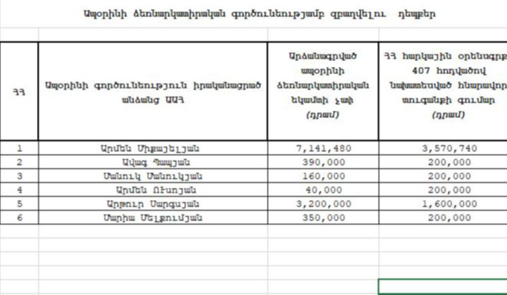 6 դեպքով կազմվել են ապօրինի ձեռնարկատիրական գործունեությամբ զբաղվելու վերաբերյալ արձանագրություններ ապօրինի ձեռնարկատիրական եկամտի չափը կազմել է 11,281,480 ՀՀ դրամ: Հնարավոր տուգանքի գումարը կազմում է 5,970,740 ՀՀ դրամ: Ներկայացվում են ապօրինի ձեռնարկատիրական գործունեությամբ զբաղվելու դեպքերը։ (Ցանկ 2)