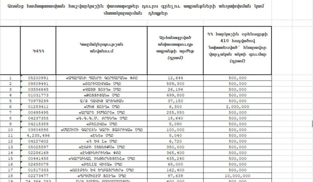 22 դեպքով արձանագրվել են առանց համապատասխան հաշվարկային փաստաթղթեր դուրս գրելու` ընդհանուր 4,398,587 ՀՀ դրամի ՀՀ հարկային օրենսգրքի պահանջների խախտումով ապրանքների տեղափոխման կամ մատակարարման դեպքեր: Հնարավոր տուգանքի գումարը կազմում է 22,000,000 ՀՀ դրամ: Ներկայացվում են առանց համապատասխան հաշվարկային փաստաթղթեր դուրս գրելու ապրանքների տեղափոխման կամ մատակարարման դեպքերը: (Ցանկ 1)