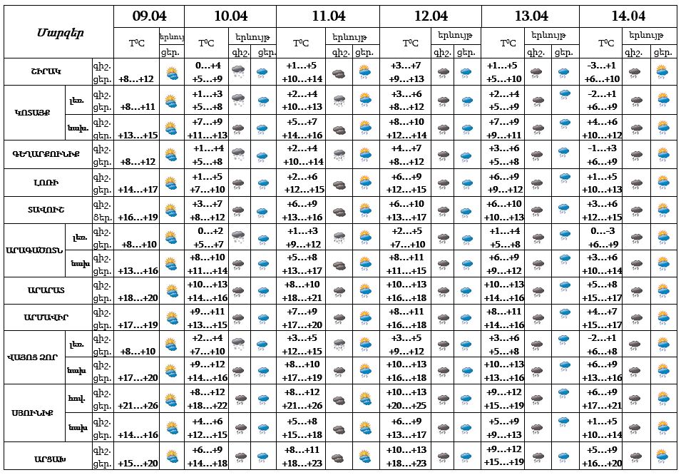 Երևան քաղաքում ապրիլի 9-ի ցերեկը, սպասվում է առանց տեղումների եղանակ։ Ապրիլի 10-14-ը ժամանակ առ ժամանակ սպասվում է անձրև: