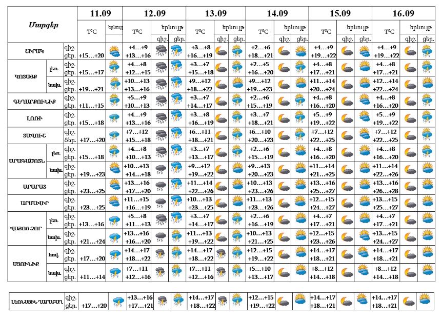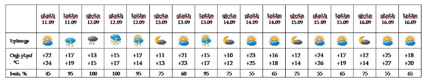 Օդի ջերմաստիճանը սեպտեմբերի 11-12-ին ցերեկը աստիճանաբար կնվազի 5-8 աստիճանով, 13-16-ին աստիճանաբար նունքան կբարձրանա։