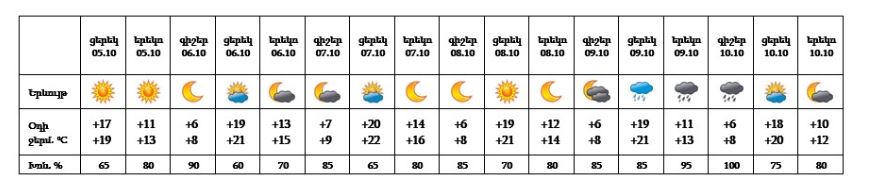 Երևան քաղաքում hոկտեմբերի 6-8-ին, 9-ի գիշերը, 10-ի ցերեկը սպասվում է առանց տեղումների եղանակ։ Հոկտեմբերի 9-ի ցերեկը, 10-ի գիշերը սպասվում է անձրև։ Հոկտեմբերի 9-ին սպասվում է քամու ուժգնացում ՝ 15-18 մ/վրկ արագությամբ։
