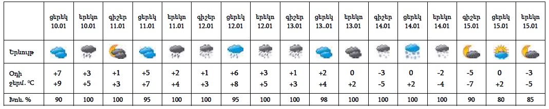 Հունվարի 10-ի և 11-ի ցերեկը, 12-13-ին առանձին շրջաններում, 14-ին շրջանների զգալի մասում սպասվում են տեղումներ և մառախուղ, տեղումները լեռնային գոտիներում կլինեն ձյան, հովտային և նախալեռնային շրջաններում անձրևի և ձնախառն անձրևի տեսքով։ Հունվարի 11-ի գիշերը, 15-ին սպասվում է առանց տեղումների եղանակ։