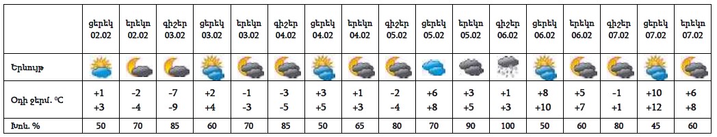 Փետրվարի 2-ի ցերեկը, 3-4-ին, 7-ին սպասվում է առանց տեղումների եղանակ։ Փետրվարի 5-ին, 6-ի ցերեկն առանձին շրջաններում, 6-ի գիշերը և առավոտյան շրջանների զգալի մասում սպասվում են տեղումներ, լեռնային շրջաններում՝ ձյան, նախալեռնային և հովտային գոտում՝ թաց ձյան և ձնախառն անձրևի տեսքով։