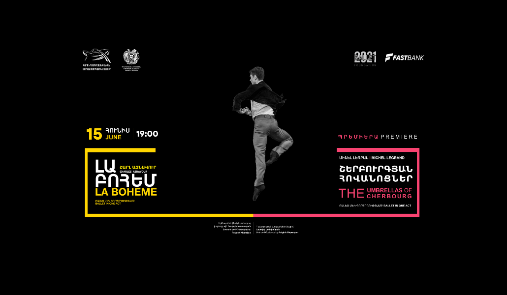 Աջակցիր «Ա1+»-ին«Բալետ 2021» հիմնադրամի նախաձեռնությամբ և Ֆասթ Բանկի աջակցությամբ հունիսի 15-ին՝ ժամը 19։00-ին Կարեն Դեմիրճյանի անվան մարզահամերգային համալիրում տեղի կունենա Շառլ Ազնավուրի «Լա Բոհեմ» և Միշել Լեգրանի «Շերբուրգյան հովանոցներ» բալետային ներկայացումների առաջնախաղը՝ նախատեսված բոլոր սերունդների ներկայացուցիչների համար։