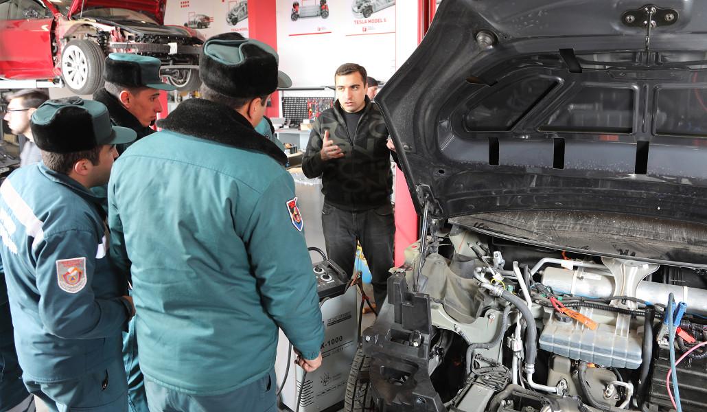 Վերապատրաստման գործնական փուլն անցել է «Eco Motors» և «Tesla Energy» ընկերությունների ավտոսրահներում, որտեղ մասնագետները փրկարարներին տեղում գործնականորեն ներկայացրել են էլեկտրական ավտոմեքենաների կառուցվածքը, առանձնահատկությունները և յուրահատկությունները, անվտանգության կանոնները, առհասարակ ինչպես աշխատել նմանատիպ ավտոմեքենաների մասնակցությամբ վթարների դեպքում՝ հաշվի առնելով բոլոր այն բարդությունները և վտանգները, որոնց կարող են առնչվել փրկարարները հրդեհաշիջման և փրկարարական աշխատանքներ իրականացնելիս: