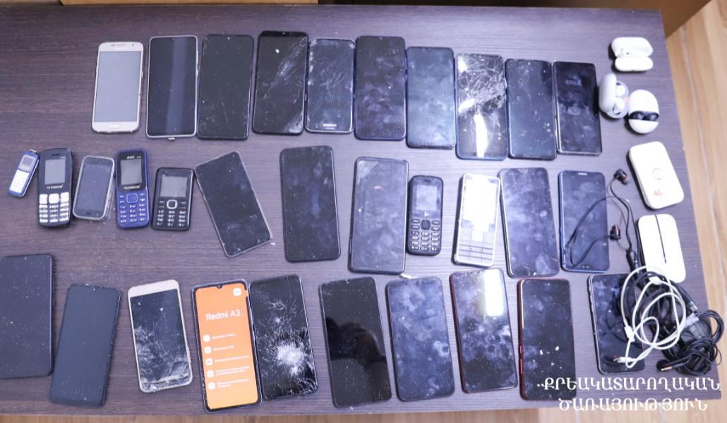Զննության արդյունքում սառնարանում նախապես պատրաստված թաքստոցից ծառայողները հայտնաբերել են 32 բջջային հեռախոս, 2 wi-fi սարք, 5 զույգ ականջակալ և 3 USB լար։