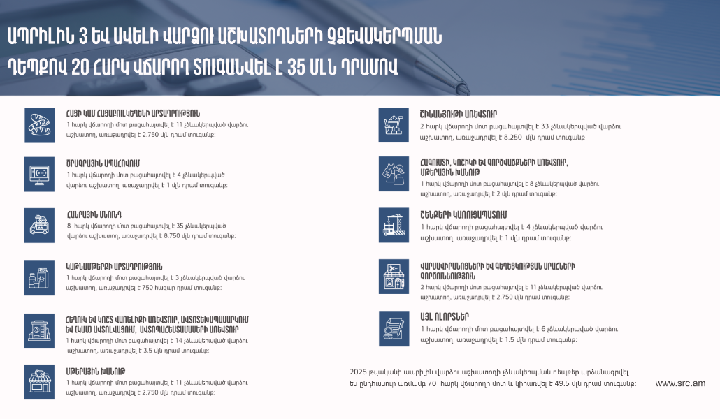 Երեք և ավելի վարձու աշխատողների չձևակերպման 20 դեպքով 20 հարկ վճարող տուգանվել է 35 մլն դրամով: Մասնավորապես, դեպքերն արձանագրվել են հետևյալ ոլորտներում․