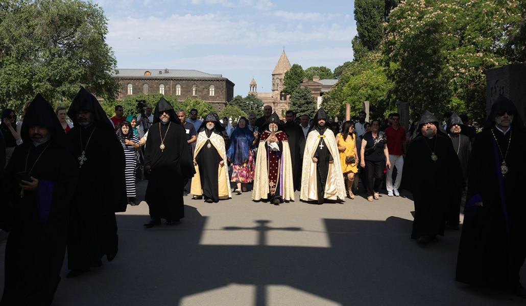 Սուրբ Գրիգոր Լուսավորչի կամարի առջև Ամենայն Հայոց Հայրապետը, սրբազան Աջով օրհնեց հոգևոր դասին և ներկա բարեպաշտ ժողովրդին՝ այն փոխանցելով Մայր Աթոռ Սուրբ Էջմիածնի լուսարարապետ Հոգեշնորհ Տ․ Անանիա վարդապետ Ծատուրյանին։