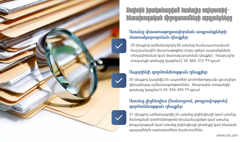 Միաժամանակ, ՊԵԿ-ը ներկայացնում է մայիսի 1-ից 31-ն ընկած ժամանակահատվածում ՊԵԿ հետաքննության և օպերատիվ հետախուզության վարչության իրականացրած հարկային իրավախախտումների կանխման, խափանման և բացահայտման ուղղությամբ համալիր օպերատիվ-հետախուզական միջոցառումների արդյունքները։