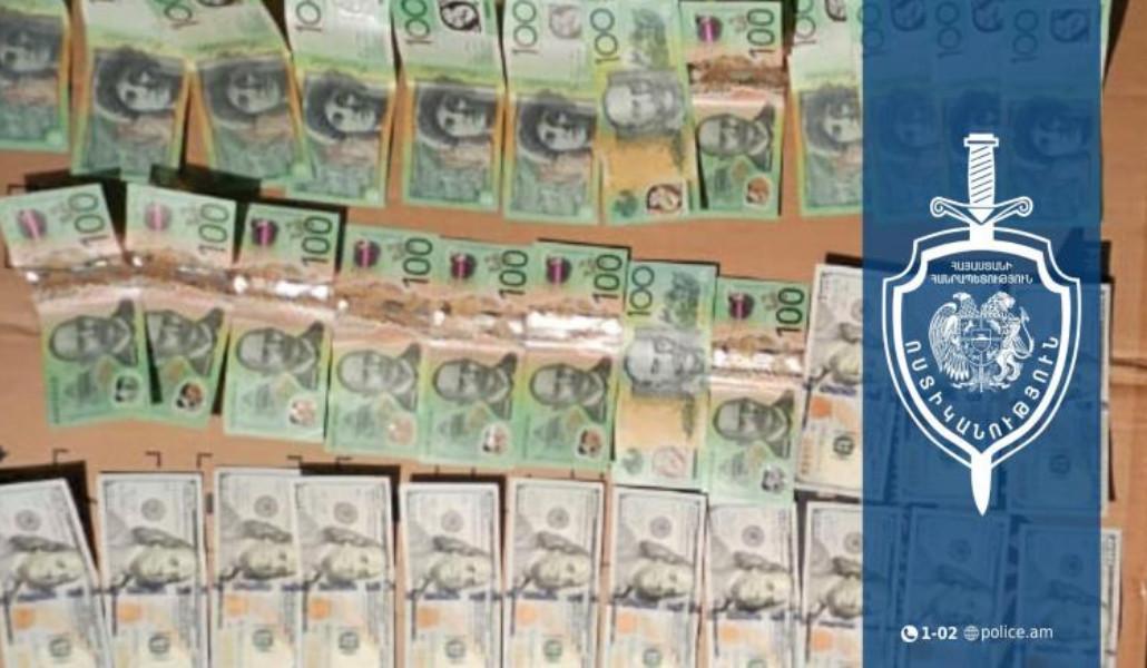 Նախաձեռնվել է քրեական վարույթ, որի շրջանակում 23-ամյա երիտասարդի բնակության վայրում կատարված խուզարկությամբ նկուղի բետոնե առաստաղի անցքում հայտնաբերվել է 45 հատ հարյուրդոլարանոց, որոնցից 25-ը` Միացյալ Նահանգների, իսկ 20-ը` ավստրալական դոլար։