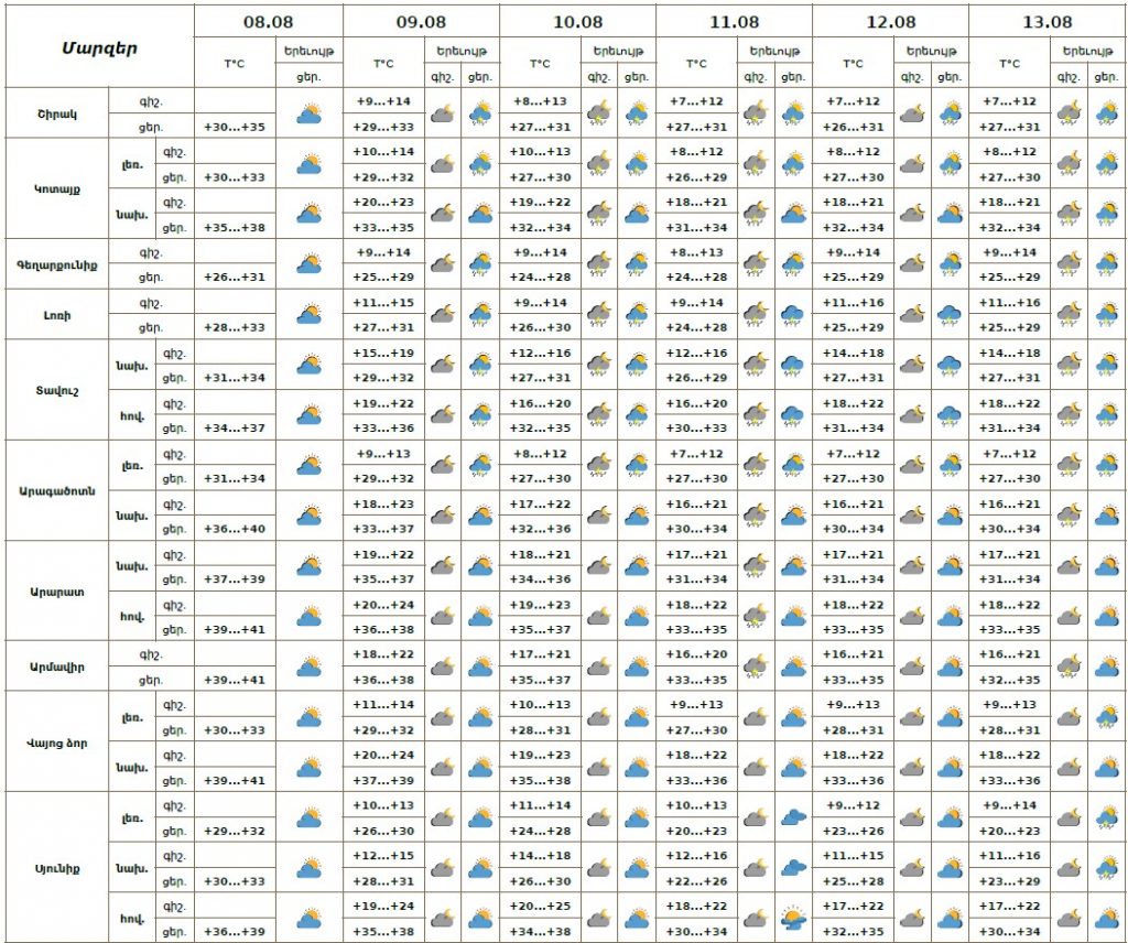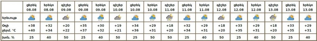 Երևանում օգոստոսի 8-ի ցերեկը սպասվում է առանց տեղումների եղանակ։ Օգոստոսի 9-ի երեկոյան, 10-12-ին գիշերը և երեկոյան, 13-ին գիշերը քաղաքի առանձին հատվածներում հնարավոր է կարճատև անձրև և ամպրոպ, ամպրոպի ժամանակ և երեկոյան ժամերին սպասվում է քամու ուժգնացում՝ 14-18 մ/վ արագությամբ։