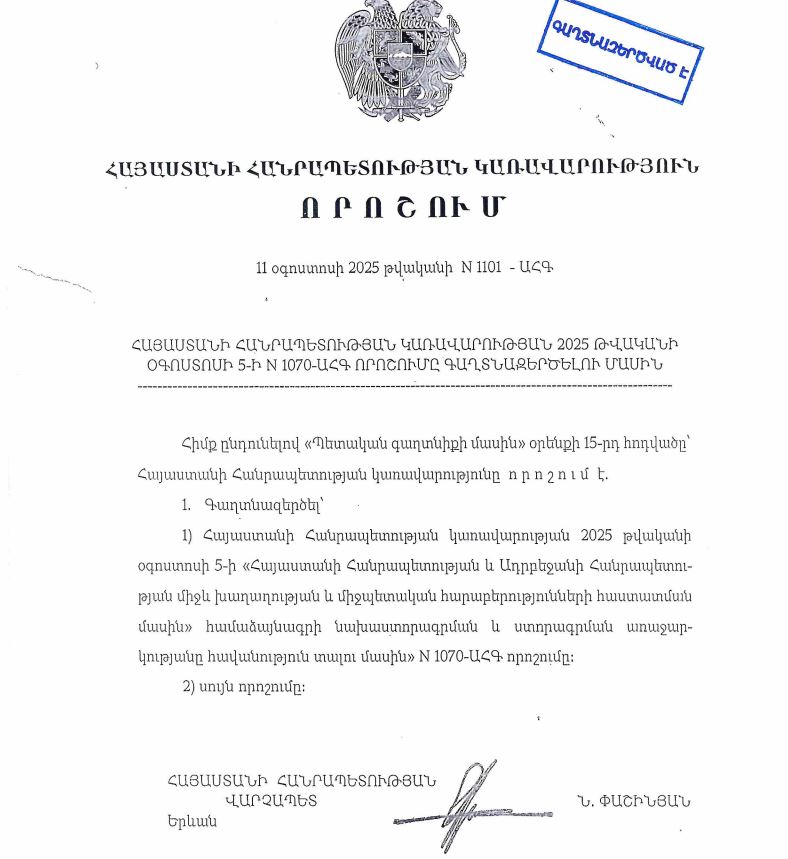 Աջակցիր «Ա1+»-ինՀՀ կառավարությունից տեղեկացնում են, որ ՀՀ վարչապետ Նիկոլ Փաշինյանը որոշում է կայացրել գաղտնազերծել «Հայաստանի Հանրապետության և Ադրբեջանի Հանրապետության միջև խաղաղության և միջպետական հարաբերությունների մասին համաձայնագրի» նախաստորագրման և ստորագրման առաջարկությանը հավանություն տալու մասին» N 1070-ԱՀԳ որոշումը։