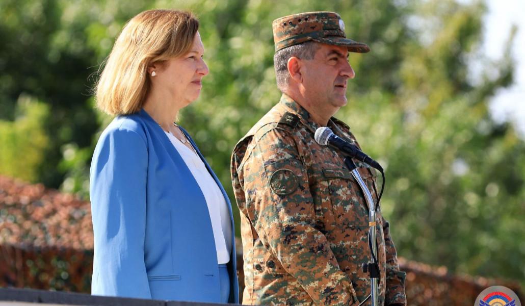 Զորավարժությանը ներգրավված զինծառայողներին ողջունել են ԶՈՒ ԳՇ պետ, գեներալ-լեյտենանտ Էդվարդ Ասրյանն ու ՀՀ-ում ԱՄՆ արտակարգ և լիազոր դեսպան Քրիստինա Քվինը։