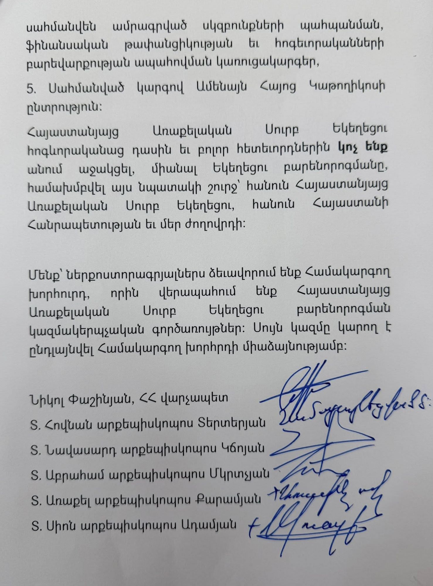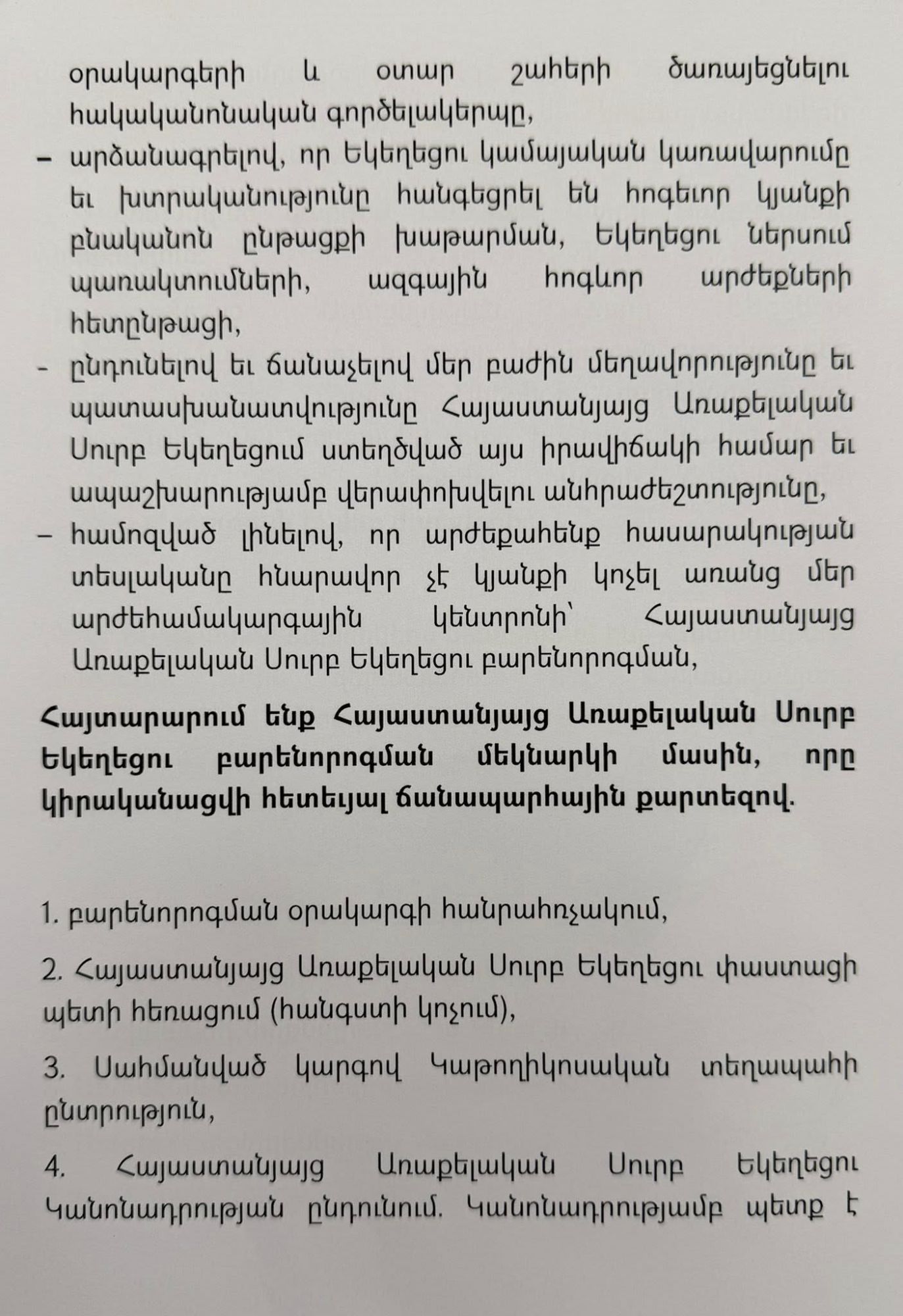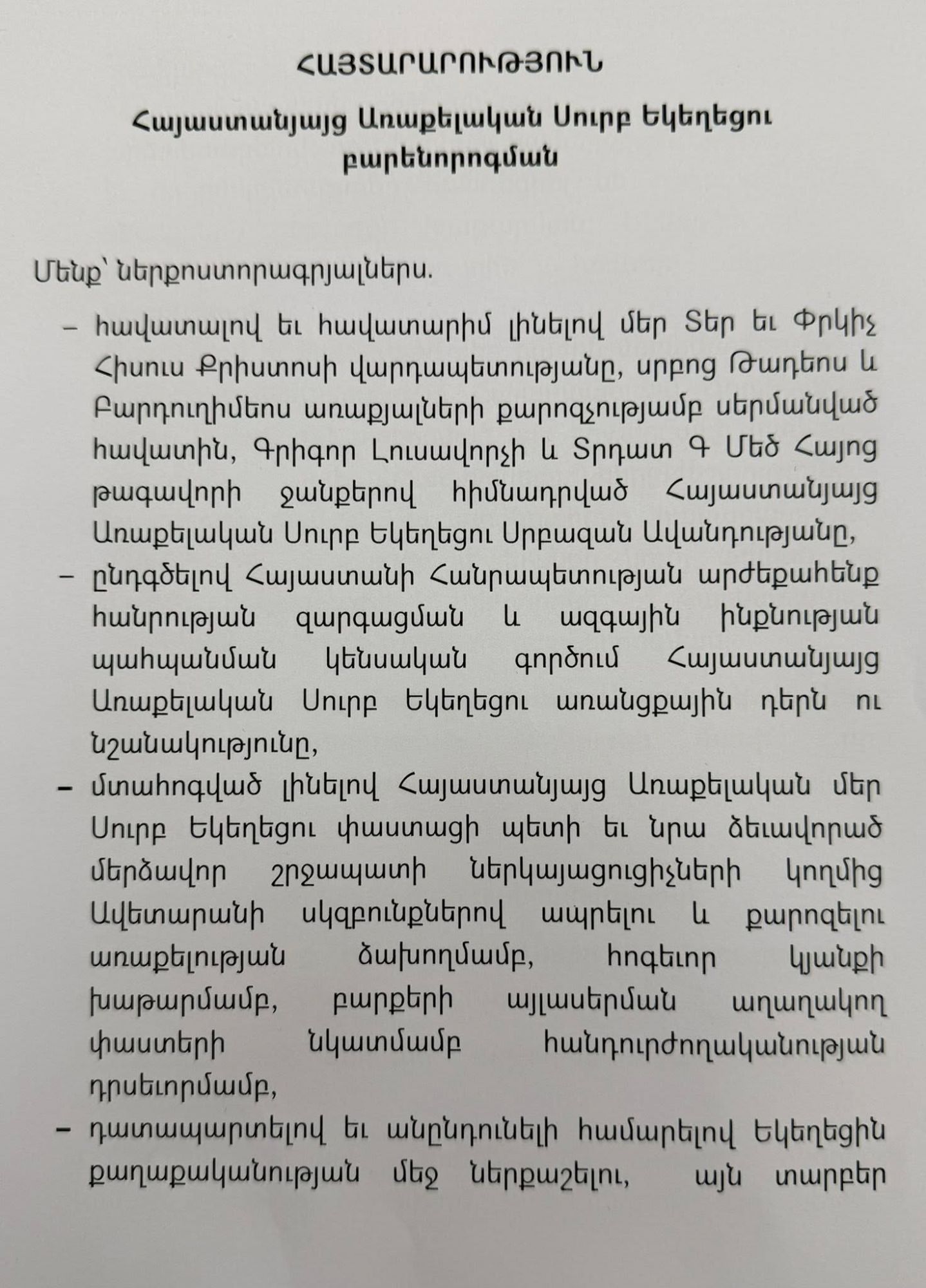 - մտահոգված լինելով Հայաստանյայց Առաքելական մեր Սուրբ Եկեղեցու փաստացի պետի և նրա ձևավորած մերձավոր շրջապատի ներկայացուցիչների կողմից Ավետարանի սկզբունքներով ապրելու և քարոզելու առաքելության ձախողմամբ, հոգևոր կյանքի խաթարմամբ, բարքերի այլասերման աղաղակող փաստերի նկատմամբ հանդուրժողականության դրսևորմամբ,