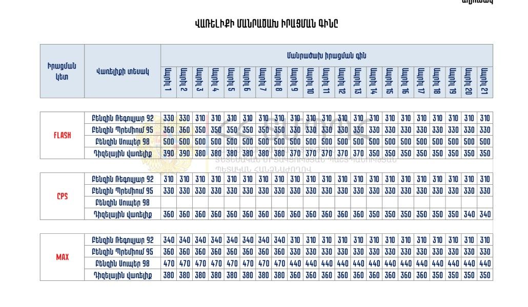 Поддержи А1+!Согласно результатам мониторинга Государственной комиссии по защите экономической конкуренции Армении, тенденция снижения розничных цен на топливо, зафиксированная в прошлом месяце у трех крупных хозяйствующих субъектов, продолжилась и в апреле.