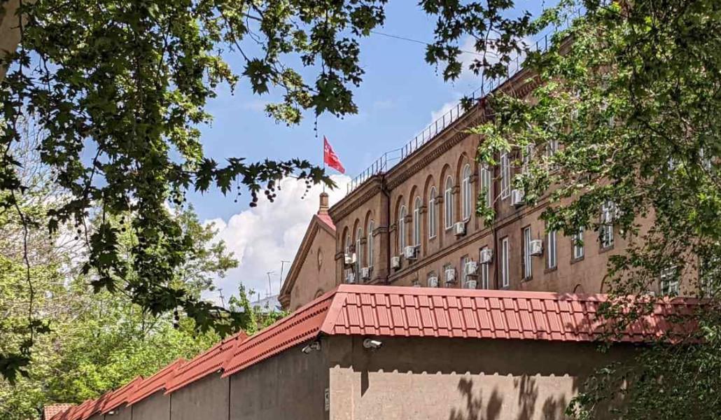 Корреспондент «А1+» сделал несколько фотографий, на которых видно, что на крыше здания развевается советский красный флаг.