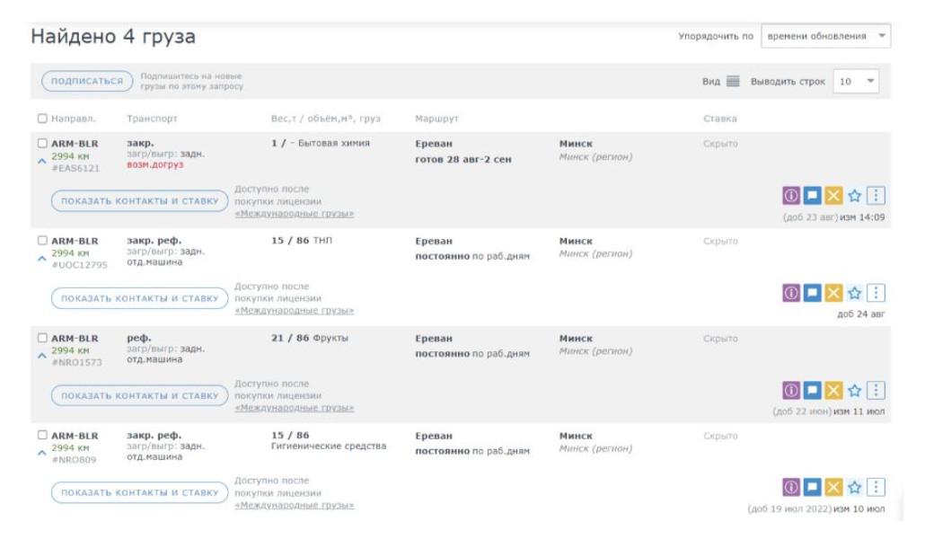 Если вы ищете заказы по Армении, вы увидите контакты в грузах и информацию о фирме бесплатно. В случае международной перевозки вы увидите примерно 30% контактов. Остальные откроет лицензия «Международные грузы» за 4 900 драмов на месяц.