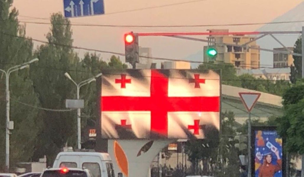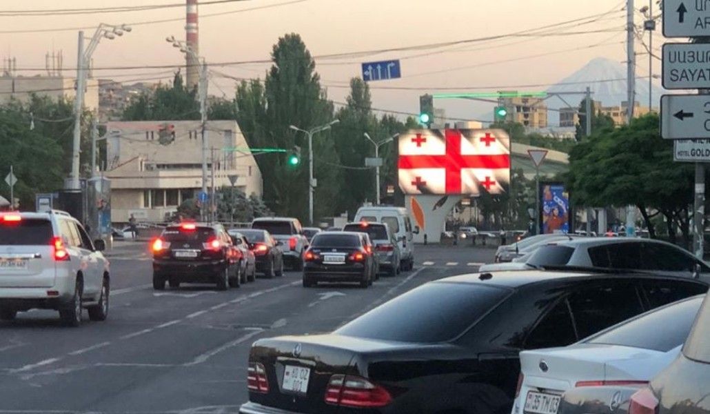 Billboards on streets of Yerevan illuminated in colors of Georgian flag