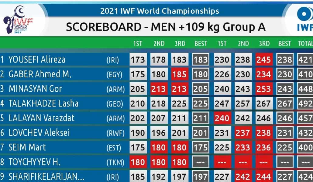 Ծանրքաշային Վարազդատ Լալայանը երկամարտի 457 կգ արդյունքով (211+246) գրավեց 2-րդ տեղը և դարձավ աշխարհի փոխչեմպիոն։ Գոռ Մինասյանը 448 կգ արդյունքով (205+243) եզրափակեց առաջին եռյակը և բավարարվեց բրոնզե մեդալով։