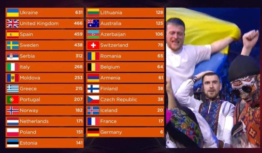 631 միավորով հաղթեց Ուկրաինան, որին «Եվրատեսիլ 2022»-ում ներկայացնում էր Kalush Orchestra-ն Stefania երգով: Խումբը ժյուրիի կողմից ստացավ 192, իսկ հեռուստադիտողի կողմից՝ 439 միավոր: