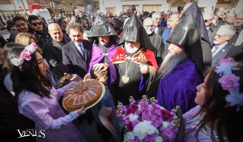Ս. Աստուածածին եկեղեցւոյ ղօղանջին ներքոյ, Նորին Սրբութիւնը դիմաւորուեցաւ Բերիոյ Հայոց Թեմի Բարեջան Առաջնորդ Գերշ. Տ. Մակար Սրբ. Եպս. Աշգարեանի, Բերիոյ Թեմի Կաթողիկէ Հայոց Առաջնորդ Արհի Տ. Պետրոս Արք. Միրիաթեանի, Սուրիոյ Հայ Աւետարանական Համայնքի Համայնքապետ Վերապատուելի դոկտ. Յարութիւն Սելիմեանի, Հալէպի գլխաւոր հիւպատոսութեան խորհրդական-հիւպատոս Բաբգէն Պատալեանի, ՀՀ մարդասիրական առաքելութեան խումբի պատասխանատուին, Սուրիոյ խորհրդարանի երեսփոխան Ժիրայր Րէիսեանի, Ազգային Երեսփոխանական Ժողովի եւ Ազգային Վարչութեան անդամներուն, հալէպահայ երեք կազմակերպութիւններու ներկայացուցիչներուն, հալէպահայ մշակութային, մարզական եւ բարեսիրական միութիւններու՝ Համազգայինի, ՀՄԸՄ-ի, ՍՕ Խաչի, ՀԲԸՄ-ի, ՀԵԸ-ի, Նոր Սերունդ, Կրթասիրաց, Ազգային Մշկթ., Գերմանիկ Վասպուրական Մշկթ. միութեանց, կրթական հաստատութիւններու ներկայացուցիչներուն, եկեղեցիներու թաղական խորհուրդներուն, դպրաց դասերուն, ՍԵՄ-ի, Սուրիոյ Պատանեկան Միութեան անդամներուն, ՀՄԸՄ-ի տարազաւոր սկաուտներուն եւ հաւատացեալ ժողովուրդին կողմէ: