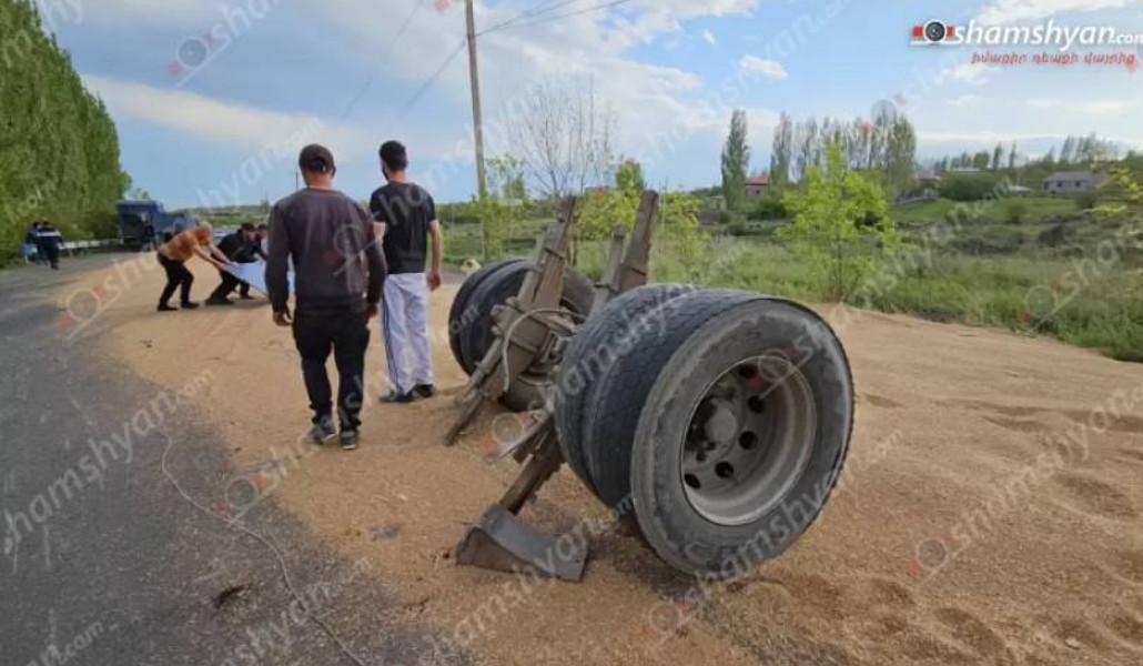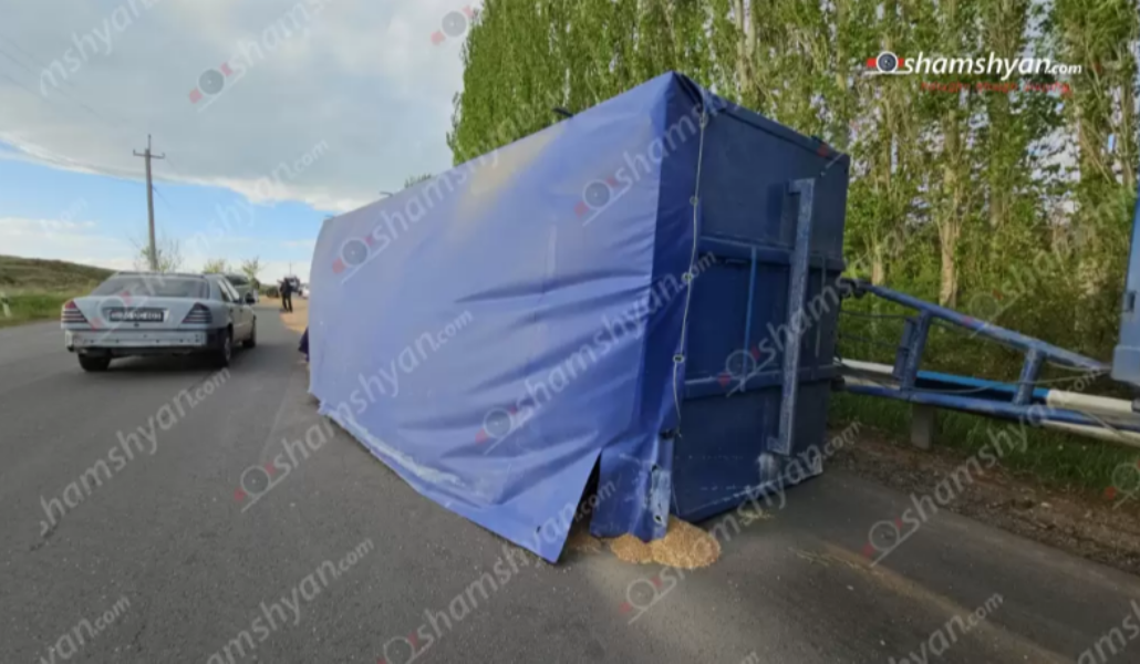 Արագածոտնում վրացի վարորդի՝ 20 տոննա ցորենով բարձված բեռնատարը կողաշրջվել է, ցորենը՝ լցվել ճանապարհով մեկ