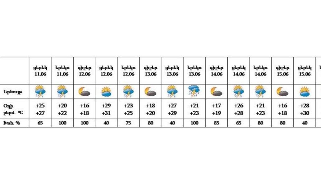 Հունիսի 11-ի ցերեկը, 13-14-ը սպասվում է, 12-ի, 15-16-ի երեկոյան ժամերին քաղաքի առանձին հատվածներում հնարավոր է կարճատև անձրև և ամպրոպ։ Ամպրոպի ժամանակ՝ քամու ուժգնացում՝ 13-16 մ/վ արագությամբ։