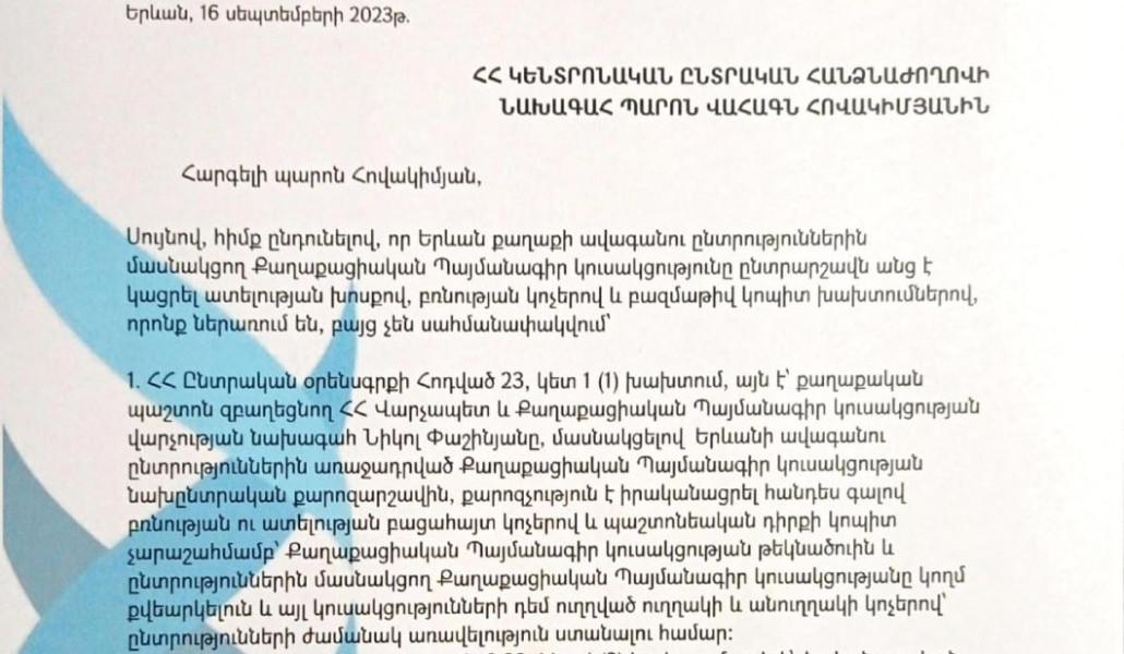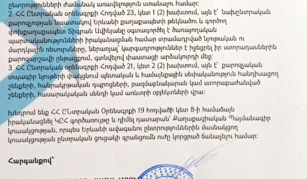 Աջակցիր «Ա1+»-ինՀիմք ընդունելով սեպտեմբերի 15-ին Երևանի ավագանու ընտրություններին մասնակից ՔՊ կուսակցության նախագահ Նիկոլ Փաշինյանի քարոզարշավային ելույթում հնչեցրած ատելության և բռնության կոչերը, Ժողովրդավարական Համախմբում կուսակցությունն ընտրախախտումների վերաբերյալ դիմում է ներկայացրել ԿԸՀ։
