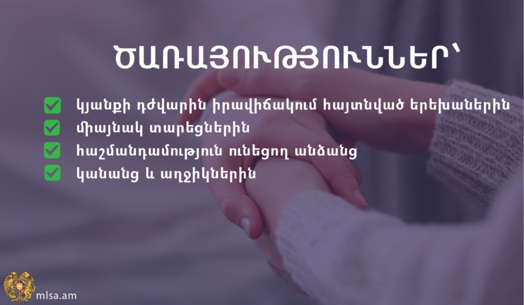 Ծառայություններ՝ կյանքի դժվարին իրավիճակում հայտնված երեխաներին, տարեցներին, հաշմանդամություն ունեցող անձանց, ինչպես նաև կանանց և աղջիկներին