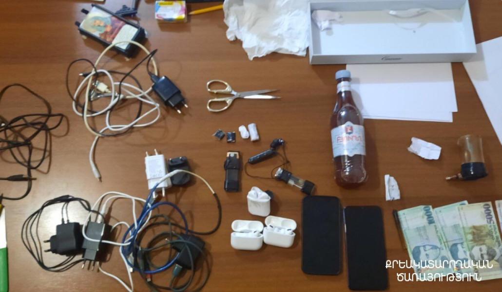 Խուզարկության արդյունքում տարբեր թաքստոցներից հայտնաբերվել են օգտագործված 5 ներարկիչ, ներարկիչի 2 ասեղ, 2 հիշողության կրիչ, 4 բջջային հեռախոս, բջջային հեռախոսի 3 բաժանորդային քարտ, լիցքավորման 4 կոճ, 8 լար, 6 ականջակալ, էլեկտրական 1 գլանակ, 2 սրվակ՝ ծխեցված հետքերով, 1 ութանկյուն նշան և 27,000 ՀՀ դրամ։