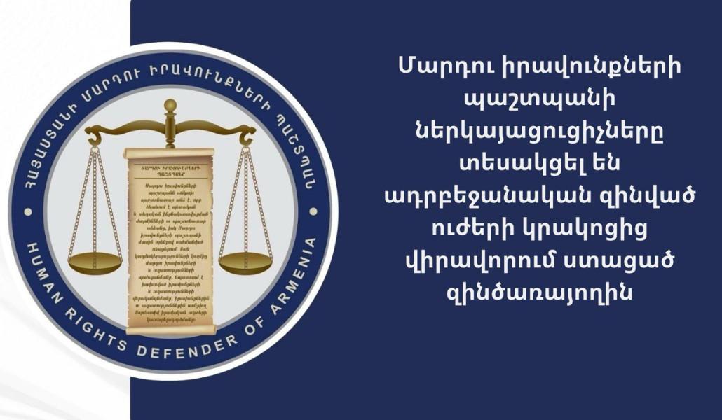 Պաշտպանի ներկայացուցիչները ծանոթացել են զինծառայողի առողջական վիճակին, բուժանձնակազմի հետ քննարկել են զինծառայողի առողջական վիճակին և բուժման ընթացքին վերաբերելի հարցեր։