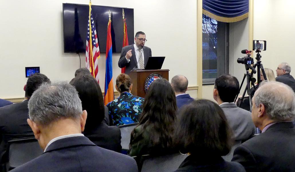 ընդգծել է հայկական ինքնիշխանությանը սպառնացող վտանգը՝ ինչպես Հարավային Կովկասում, այնպես էլ նրա սահմաններից դուրս՝ ներառյալ Երուսաղեմի հայկական թաղամասում։ Բանախոսը հանգամանորեն ներկայացրել է հայության նկատմամբ ադրբեջանական ցեղասպան քաղաքականության էությունը և Բաքվի բռնապետական վարչակարգի ներկա քաղաքական առաջնահերթությունները։