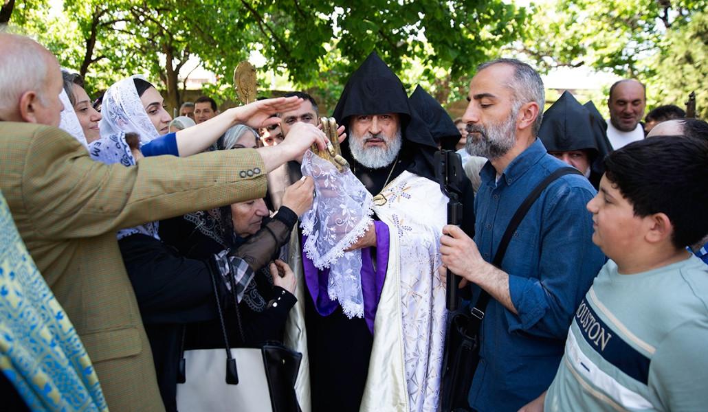 Սուրբ Հռիփսիմե վանքի առջև թափորը դիմավորեցին վանքի հոգևոր սպասավորները և տարբեր վայրերից ժամանած բազում ուխտավորներ` Մայր Աթոռ Սուրբ Էջմիածնի Վանորեից տեսուչ Գերաշնորհ Տ. Արտակ եպիսկոպոս Տիգրանյանի գլխավորությամբ: