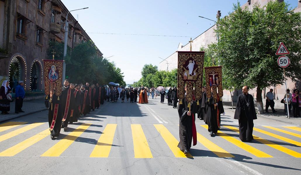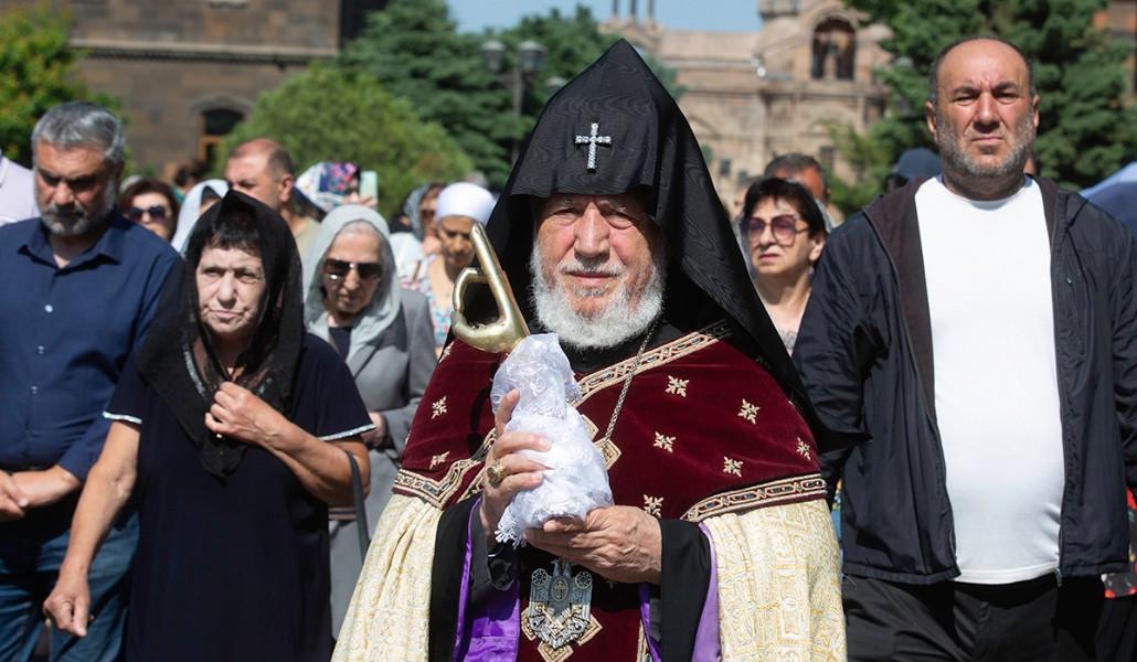 Առավոտյան Մայր Աթոռ Սուրբ Էջմիածնից եկեղեցականների թափորը հավատացյալների ուղեկցությամբ, Էջմիածնի Հայորդյաց տան սաների թմբուկների զարկերի ներքո, շարժվեց դեպի Սուրբ Հռիփսիմե վանք` տանելով սուրբ Հռիփսիմեի մասունքները: Սուրբ Գրիգոր Լուսավորչի կամարի առջև Ամենայն Հայոց Հայրապետը, սրբազան Աջով օրհնելով հոգևոր դասին և ներկա բարեպաշտ ժողովրդին, այն փոխանցեց Մայր Աթոռի լուսարարապետի պաշտոնակատար Հոգեշնորհ Տ. Հարություն վարդապետ Կիրակոսյանին: