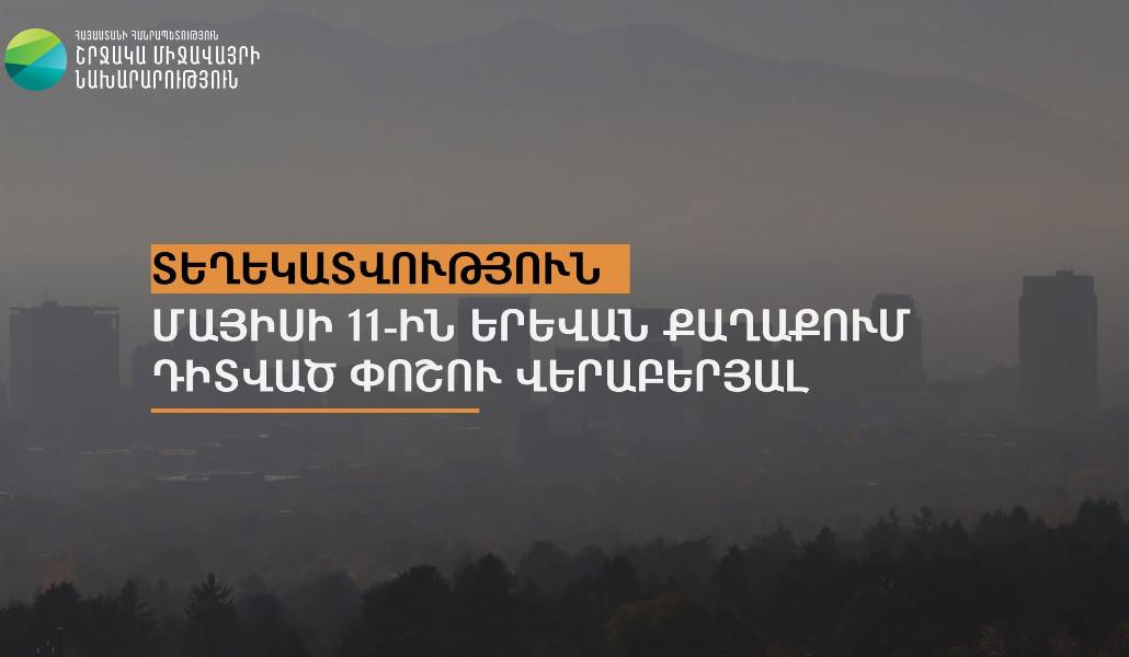 Ուժեղ քամու հետևանքով մայիսի 11-ին Երևան քաղաքի կենտրոնում արձանագրվել է մթնոլորտային օդում բաղադրությամբ չտարբերակվող փոշու կոնցենտրացիայի զգալի աճ նախորդող օրերի համեմատությամբ՝ հասնելով 0.589 մգ/մ³-ի, ինչը 3.9 անգամ գերազանցել է սահմանային թույլատրելի կոնցենտրացիան: Նախորդ օրվա՝ մայիսի 10-ին դիտված ցուցանիշից այն բարձր է եղել 6 անգամ։